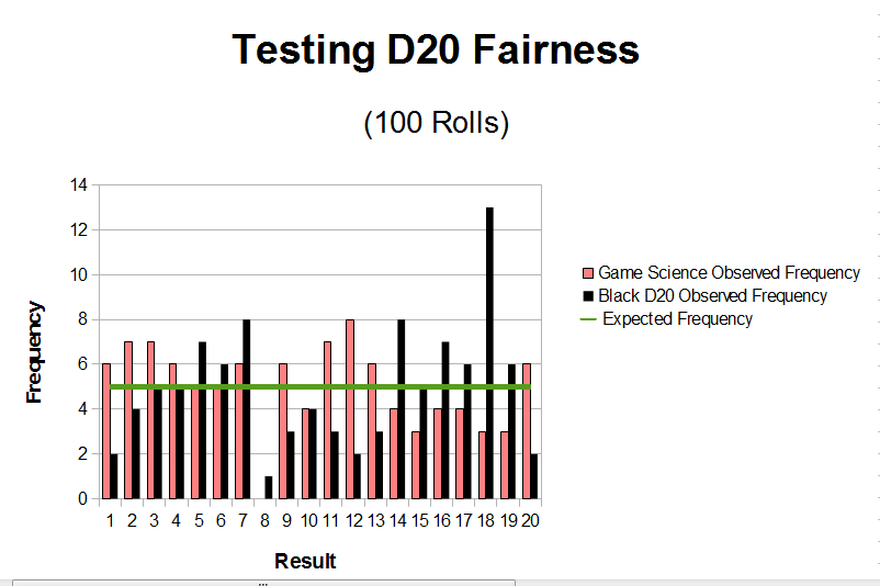 If the observed distribution is 80% likely given the expected distribution of a fair die, then I'd bet that the die is fair (or at least as close to fair as is easily observable). Therefore Game Science die passes the test of fairness fairly well. The Black D20, however, is a lot more problematic. I will be testing more of my dice to see if I observe similar results. In the mean time, however, I think the black D20 will be the designated "hit the bad guys" die.
